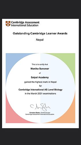 Unsere Absolventin Monika-Sunuwar hat sich schon etliche Male hervorgetan. Trotz ihrer schwierigen Kindheit ist sie nicht nur diejenige, die Deutsch am besten beherrscht, sondern wurde nun auch vom Cambridge Assessment, International Education ausgezeichnet. Monika hat die beste Biologie-Prüfung von ganz Nepal absolviert!