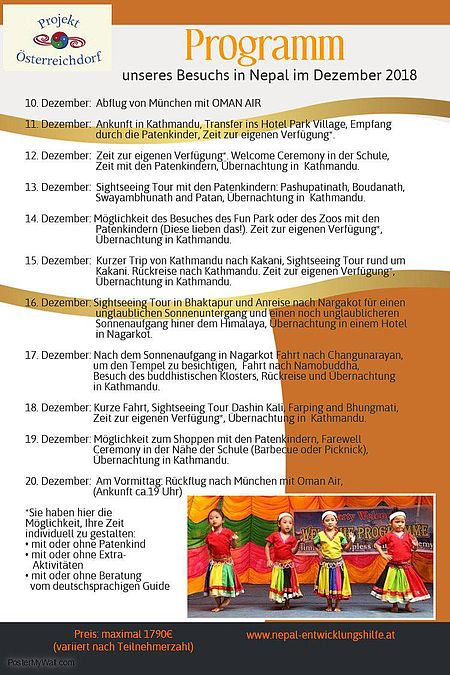 Sehen Sie hier das Programm unserer großen Patenelternreise 2018! Bei Fragen oder Interesse wenden Sie sich einfach an franz.bachinger(at)nepal-entwicklungshilfe.at!