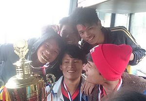 Mehrmals pro Woche werden sie morgens vor der Schule von unserem allseits beliebten Coach Sagar Shrestha trainiert. Was sie aber richtig gefährlich macht, ist ihre Leidenschaft für’s Basketballspielen: Sie spielen quasi in jeder freien Minute und üben Passspiel, Freiwürfe oder das Eins gegen Eins bis zur Perfektion. Dieser Einsatz zahlt sich auch aus und zeigt sich in den hervorragenden Ergebnissen. Darüber hinaus haben die HHCA Hoopsterz eine Geheimwaffe: Sie sind kein Team. Sie sind eine Familie. Ohne ausgeklügelte Basketball-Routinen zu kennen oder Team Moves einzustudieren, bewegen sich unsere Jungs und Mädels wie ein Organismus und zeigen Profi-Teams von Kathmandus Elite-Schulen, wie man richtig Basketball spielt. Die Spiele unserer Basketball-Cracks sind meist ein wahres Highlight, vor allem die Finals. Die Teams werden vor Ort von mitkommenden Mitschülern angefeuert und die Sprechgesänge sorgen für unglaubliche Stimmung. Jeder Punkt wird mit Applaus und Jubel gefeiert und wenn es einmal nicht so gut läuft, sorgt die ungebrochene Euphorie für Motivation, um wieder stärker zu werden und über sich hinauszuwachsen. Am Rückweg zur Schule verwandeln die Schüler das Fahrzeug in einen Partybus und feiern ihre Erfolge lautstark auf der gesamten Fahrt. Die einzigartige Stimmung im Team und in der gesamten HHCA suchen in Kathmandu ihresgleichen und sind mit Sicherheit ein weiterer Grund, warum die Hoopsterz Turnier für Turnier andere Teams in die Schranken weisen.